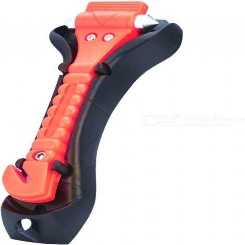 Traditionele veiligheidshamer voor in de auto. Dubbelzijdige hamerkop en handgreep met ingebouwd gordelmes.